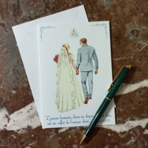 Carte double imprimée sur papier couché brillant 350 g/m2 aux dimensions 10.5 cm x 15 cm format fermé (21 cm x 15 cm format ouvert).